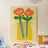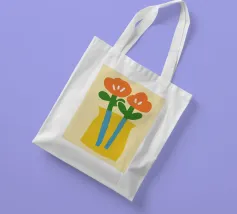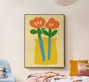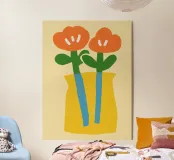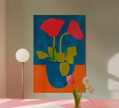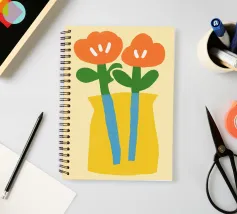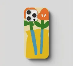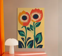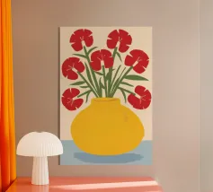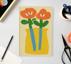 Fiori dai colori vivaci con petali arancioni e foglie verdi si trovano in un vaso giallo su uno sfondo neutro. Il design semplice e deciso utilizza forme piatte e colori vivaci per creare un'estetica allegra e moderna.