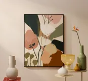 Una composizione floreale audace e contemporanea, caratterizzata da ampie pennellate di verde terra, terracotta, blush tenue e nero profondo. Il contrasto grafico e le forme semplificate rendono questo pezzo perfetto per interni moderni, eclettici o minimalisti.