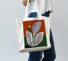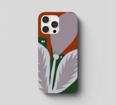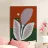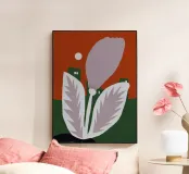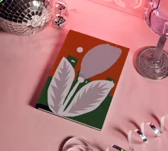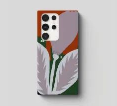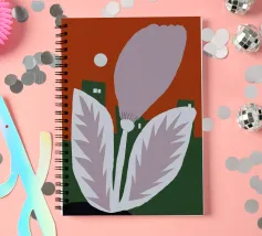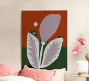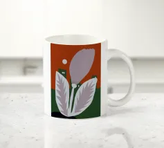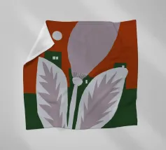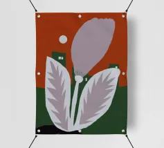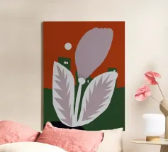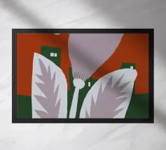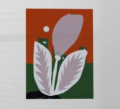 Un fiore stilizzato con grandi foglie si staglia sullo sfondo di edifici geometrici verdi e di un cielo rosso. Il sole appare come un piccolo cerchio bianco, aggiungendo un tocco minimalista alla scena.