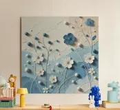 Il colore applicato crea una texture vivace, quasi tangibile, che infonde vita ai fiori. Nonostante le pennellate decise, il dipinto irradia una struttura calma che pone lo spettatore in un dialogo tranquillo con la natura. I colori blu e bianco si armonizzano perfettamente e trasmettono una sensazione di pace e innocenza. Quest'opera d'arte è un'ode alla bellezza tranquilla e travolgente della natura, toccante nella sua semplicità e profondità.