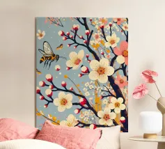 Il disegno dettagliato presenta una varietà di fiori vivaci visitati da api indaffarate.