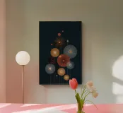 Un'impressionante esibizione di fuochi d'artificio astratti resi in una pulita geometria Bauhaus. Linee radianti e audaci esplosioni circolari illuminano la tela scura con un contrasto festoso e un tocco minimalista. Una celebrazione del movimento, del ritmo e della magia delle feste, perfetta per gli interni moderni alla ricerca di un tocco stagionale unico.