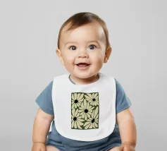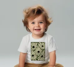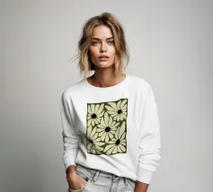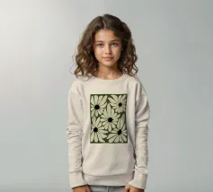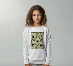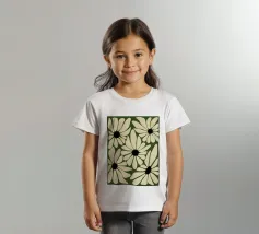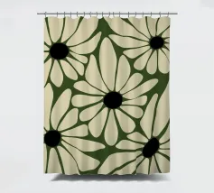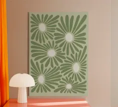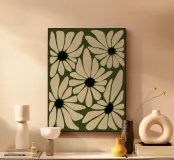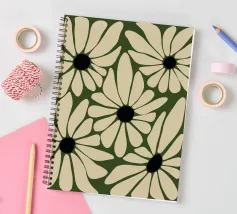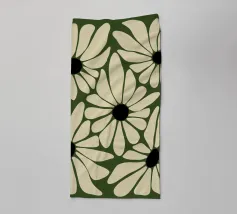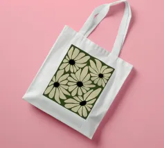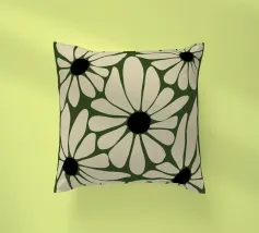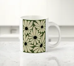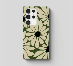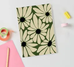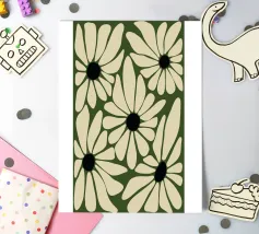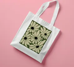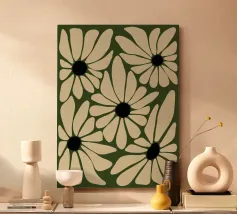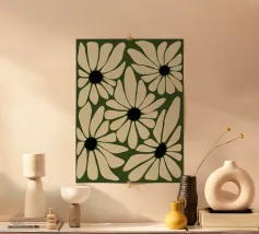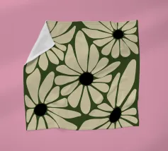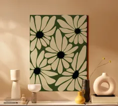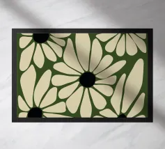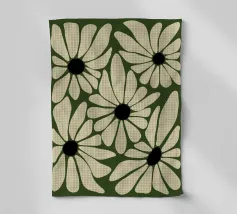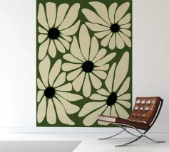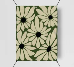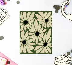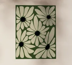 Cinque fiori stilizzati con grandi petali e centri scuri sono disposti su uno sfondo verde scuro. Il design semplice enfatizza il contrasto tra i petali chiari e i centri scuri.