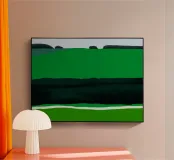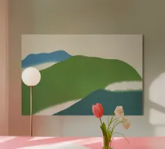 A series of layered greens and dark tones suggest a minimalist landscape. The composition evokes a sense of tranquility with horizontal bands that mimic fields and distant hills.