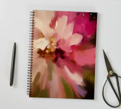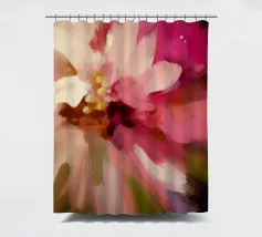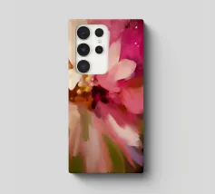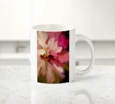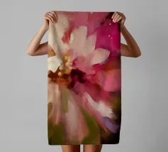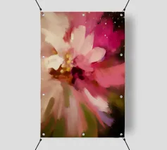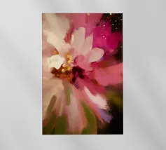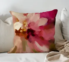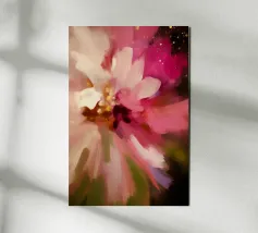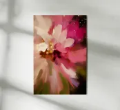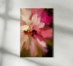 Acrylic painting of a vibrant pink blossom bursting with energy. The flower, rendered in bold, abstract strokes, radiates life with layered textures and varying shades of pink, from soft blush to deep magenta. Contrasting splashes of white and subtle hints of green create movement, while the background is minimalist, a gradient of neutral tones allowing the blossom to take center stage. The modern, contemporary style merges abstraction with the organic form, celebrating the essence of blooming vitality and nature's dynamic spirit.