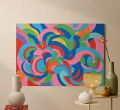 Un audace motivo astratto con un tocco di energia dinamica che simboleggia il movimento e la fluidità. Colori vivaci che evocano temi come l'acqua, la vita e il movimento. Una fusione innovativa di tradizione e modernità per interni contemporanei e minimalisti. Un linguaggio visivo unico che supera i confini culturali.