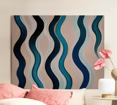 Un audace motivo astratto con un tocco di energia dinamica che simboleggia il movimento e la fluidità. Colori vivaci che evocano temi come l'acqua, la vita e il movimento. Una fusione innovativa di tradizione e modernità per interni contemporanei e minimalisti. Un linguaggio visivo unico che supera i confini culturali.