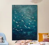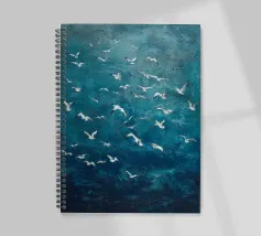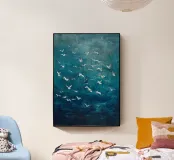 "Flight Over Stillness" (Volo sulla quiete) cattura un momento di quieta maestosità, mentre gli uccelli marini si disperdono in una vasta distesa di profondo blu oceanico. La tecnica della pittura a olio aggiunge profondità e movimento, con ogni uccello inciso come un pensiero fugace nel cielo. Il contrasto tra il mare immobile e il battito d'ali evoca un senso di libertà, contemplazione e fragile bellezza. Un'opera poetica in cui la calma incontra il movimento in un perfetto equilibrio visivo.