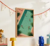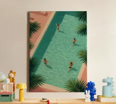 Una piscina bagnata dal sole e incorniciata da palme e piastrelle coralline fa da sfondo a un tranquillo balletto di corpi e luce. Quattro nuotatori scivolano senza peso nell'acqua, creando increspature che riecheggiano la quiete dell'estate. Le ombre giocano sotto la superficie e tutto rallenta nel ritmo di un pomeriggio fluttuante.