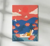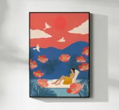 Tra imponenti papaveri corallini e palme piumate, una donna si sdraia pacificamente sotto un audace sole rosso, galleggiando su una pozza di quiete. Uccelli bianchi si librano in un cielo da sogno, facendo eco all'immobilità della sua posa. La scena, sullo sfondo di ricche montagne indaco e di un cielo color mandarino, cattura un'armonia surreale tra la natura e il sé, un momento sospeso in cui il tempo fiorisce e il pensiero si dissolve nel colore e nella calma.