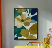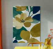 A vivid botanical abstraction featuring a golden blossom surrounded by bold green, deep navy, and olive leaves. The energetic brushstrokes and rich palette bring a sense of vibrancy and modern sophistication — perfect for contemporary spaces with a colorful edge.