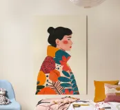Un'illustrazione stravagante e moderna di una donna avvolta in un vivace cappotto floreale, che unisce femminilità, natura ed emancipazione. Gli audaci motivi botanici e le morbide texture creano un sorprendente equilibrio tra delicatezza e forza interiore. Perfetto per aggiungere un tocco di colore, stile ed energia all'interno di ambienti contemporanei, pareti ispirate alla moda o spazi che celebrano l'emancipazione e l'individualità.