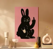 Questo poster sfacciato con un simpatico coniglio nero illustrato su uno sfondo rosa acceso offre il massimo contrasto tra un look zuccheroso e un messaggio chiaro. Il coniglietto sorridente fa con nonchalance il dito medio: una dichiarazione ironica per chiunque abbia senso dell'umorismo, attitudine e un debole per l'arte animale ironica. Perfetto per uffici, appartamenti condivisi o spazi creativi.