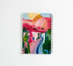 Un vivace paesaggio astratto con forme fluide che suggeriscono colline colorate, un fiume tortuoso e un cielo dinamico, in rosa, rosso, blu, verde e giallo.