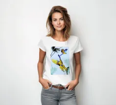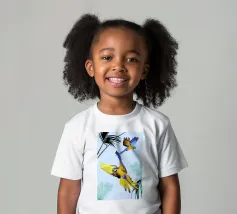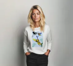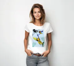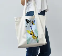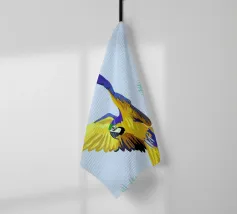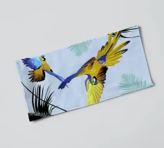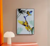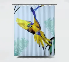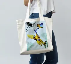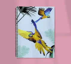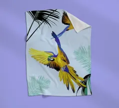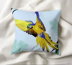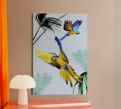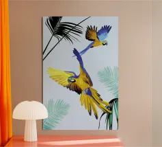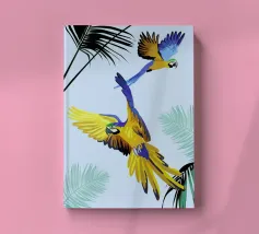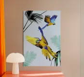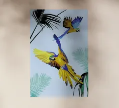 Due pappagalli in un'illustrazione in tutte le tonalità del blu e del giallo.