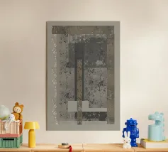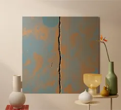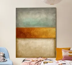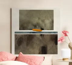 Pittura astratta e minimalista con un'attenzione particolare alla texture, al colore e ai toni della terra. Una singola forma arancione brillante si trova in cima alla linea di demarcazione. La sua consistenza liscia e la sua forma geometrica si stagliano contro la consistenza ruvida dello sfondo. Il dipinto evoca un senso di quiete e contemplazione. Le texture contrastanti, la tavolozza dei colori tenui e la composizione minimalista creano un equilibrio armonioso tra ruvidità e levigatezza, pesantezza e leggerezza. L'elemento arancione brillante funge da punto focale, attirando lo sguardo dell'osservatore e aggiungendo un elemento di sorpresa ed energia.