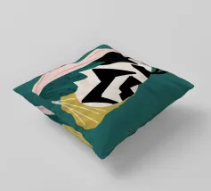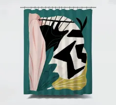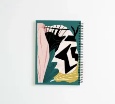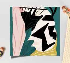 Un'opera d'arte astratta elegante e lunatica presenta foglie stilizzate in nero, bianco e marrone su uno sfondo verde acqua intenso, creando una composizione botanica sofisticata e drammatica.