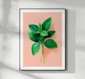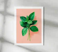 Lussureggiante illustrazione di un mazzo di foglie di basilico verde brillante su un morbido sfondo color pesca. Questa stampa moderna per la cucina conferisce una fresca atmosfera di cucina italiana al vostro spazio e aggiunge un accento pulito ed erbaceo alla parete della vostra dispensa o alla zona pranzo.