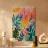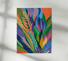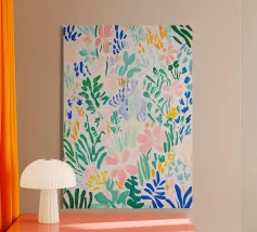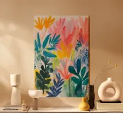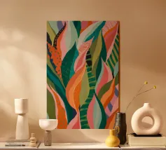 Il fogliame vibrante in varie tonalità di blu, rosa e giallo crea una rappresentazione vivace e colorata della natura. Le forme astratte si sovrappongono e si fondono, suggerendo una scena di giardino lussureggiante e variegata.