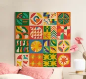 Un motivo vivace e intricato che ricorda una trapunta, composto da vari quadrati con simboli e disegni geometrici ispirati all'arte popolare. La ricca tavolozza di colori crea un'atmosfera calda e artigianale.