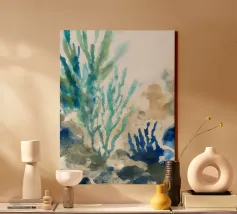 Questo acquerello arioso evoca un momento di quiete in una pozza di marea: la luce del sole filtra attraverso le acque poco profonde, rivelando piante marine di colore verde acqua, cobalto e ocra sabbioso. Grazie alle pennellate fluide e alle texture naturali, l'opera offre uno sguardo concreto e tranquillo sugli ecosistemi costieri.