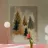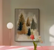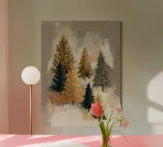 Stampa d'arte da parete della foresta scandinava con alberi verdi e oro. Decorazioni natalizie neutre e minimali con toni invernali morbidi.