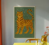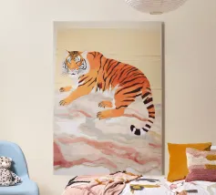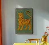 Una nobile tigre sta all'erta su uno sfondo verde foresta, con il suo manto ambrato tracciato da calde strisce marroni e cosparso di morbidi petali bianchi che scivolano come una nevicata. Ispirandosi a stampe vintage di animali selvatici e al minimalismo moderno, la composizione bilancia forza e serenità. Stampato su carta d'archivio di qualità museale, ogni pennellata e striscia rimane nitida. Perfetto per uffici, tane o interni ispirati alla natura, evoca un'energia primordiale e una tranquilla sicurezza, ricordando agli spettatori di stare in piedi e muoversi con grazia risoluta.