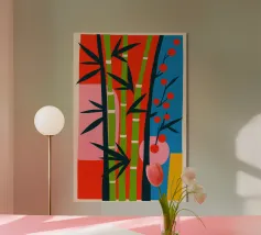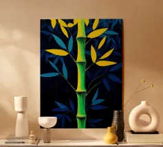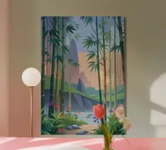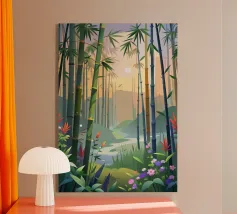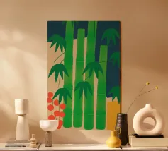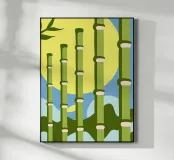 Un'illustrazione che presenta una foresta di bambù con uno stile semplice, utilizzando i colori verde, blu e giallo. Questa illustrazione offre un aspetto calmo e naturale.