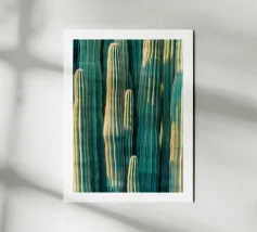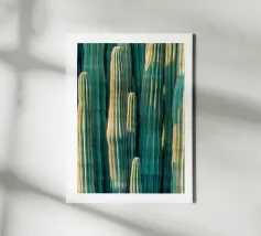 Illustrazione artistica raffigurante una fitta foresta di cactus nei toni del verde e dell'oro, che cattura la bellezza unica del deserto. Un poster perfetto per una decorazione murale moderna e naturale, ideale per un'atmosfera esotica e rilassante.