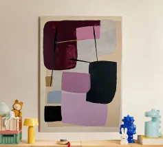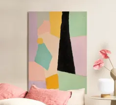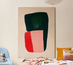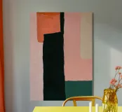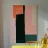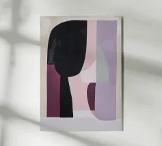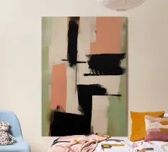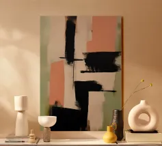 Un dipinto minimalista con una tavolozza di colori rosa e verdi, pennellate spesse e forme astratte. Un grande rettangolo nero verticale si trova al centro della composizione, illustrando i principi del minimalismo e l'uso dello spazio negativo. Il dipinto contiene anche tonalità arancioni chiare e rosse scure, che creano un'opera visivamente sorprendente ed equilibrata.