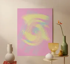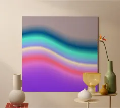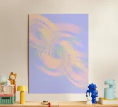 Due forme dai contorni fusi si fronteggiano, come se levitassero. I loro colori cangianti ondeggiano su uno sfondo color lavanda, creando un effetto calmo e ipnotico. L'immagine evoca un dialogo silenzioso tra due entità astratte, vicine ma separate, in uno spazio fluttuante.