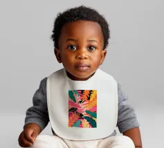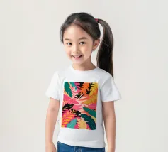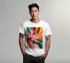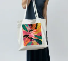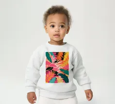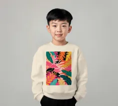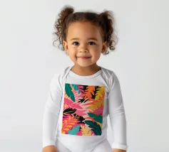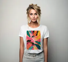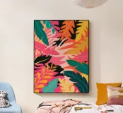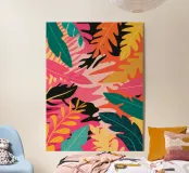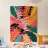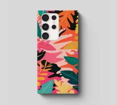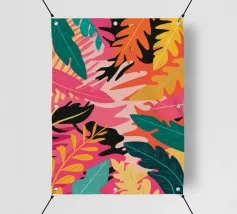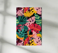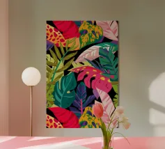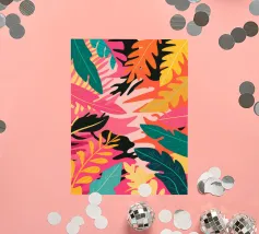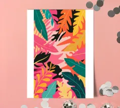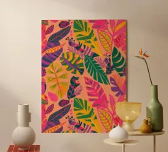 Una composizione audace e astratta di foglie e forme tropicali sovradimensionate in rosa, arancione, verde e giallo vivaci, che creano un'atmosfera dinamica ed energica di giungla.