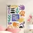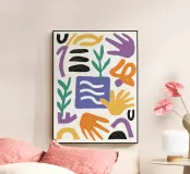 Una composizione dinamica di varie forme astratte, ghirigori e forme simili a foglie in una tavolozza giocosa di viola, blu e arancione, sparse su uno sfondo bianco.
