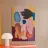 A contemporary abstract artwork featuring overlapping, fluid shapes that suggest human forms and hands, in a sophisticated palette of blue, brown, pink, and beige.