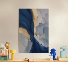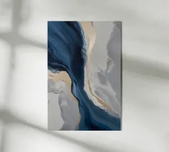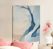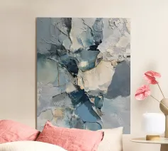 Pittura a olio astratta con forme bianche e blu chiaro, completate da beige, blu navy e grigio su uno sfondo chiaro. Curve e pennellate delicate creano una composizione minimalista e moderna con una superficie strutturata.