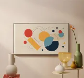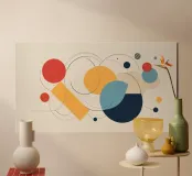 L'opera d'arte presenta una disposizione dinamica di forme geometriche dai colori vivaci. Cerchi, rettangoli e linee si intrecciano, creando un senso di movimento ed equilibrio.