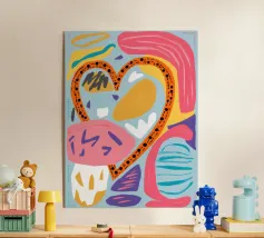 Un'opera d'arte astratta vibrante e strutturata è piena di forme organiche e giocose nei colori rosa, giallo, blu e verde, creando una composizione gioiosa ed energica che ricorda un collage.