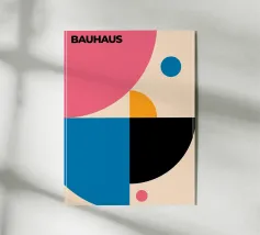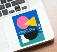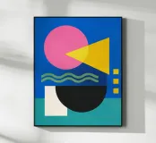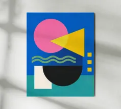 Una composizione astratta fatta di forme geometriche chiare e colori vivaci. Cerchio, triangolo e semicerchio sono in un equilibrio interessante, mentre la linea ondulata porta un movimento tranquillo, quasi meditativo, nell'immagine. La tavolozza di colori blu, rosa, giallo, verde e nero ricorda l'estate, l'acqua e la luce, moderna, essenziale e allo stesso tempo giocosa.