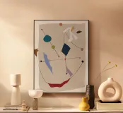 Forme astratte in colori tenui sono collegate tra loro da sottili linee nere, creando una composizione dinamica. Il disegno incorpora varie forme geometriche e organiche, aggiungendo un senso di equilibrio e movimento.