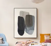 A modern abstract composition featuring overlapping organic shapes with vertical line accents. The earthy neutrals and deep tones contrast with soft watercolor textures, creating a sense of rhythm and quiet balance. Minimalist yet expressive, this piece blends geometry with fluidity for a contemporary, Scandinavian-inspired feel.