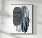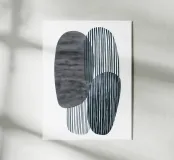Un astratto pulito e minimalista, caratterizzato da forme ovali sovrapposte in toni tenui di carbone con motivi di linee verticali. Il gioco di lavaggi solidi e texture lineari crea ritmo e armonia, riflettendo la semplicità del design scandinavo e la moderna astrazione geometrica.
