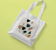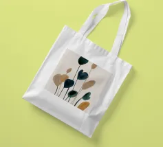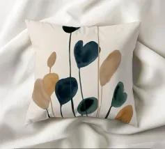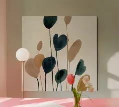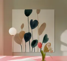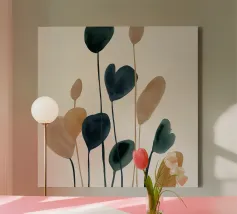 Una composizione minimalista ad acquerello con steli sottili e forme astratte di foglie nei colori verde intenso, blu, tortora e ocra. La disposizione verticale e le delicate pennellate di colore evocano un'eleganza tranquilla e organica, perfetta per interni moderni e ispirati alla natura.