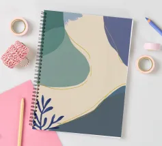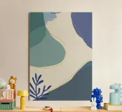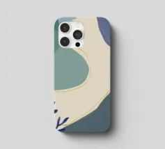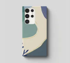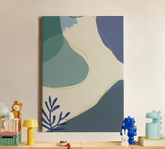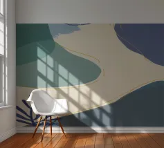 Un'opera d'arte astratta e rilassante che presenta una composizione di forme organiche e fluide in una tavolozza tenue di blu, verde e beige, accentuata da un'unica linea dorata. L'opera è serena, minimalista e sofisticata.