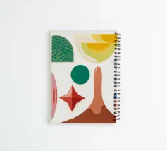 Questo dipinto presenta varie forme astratte dai colori vivaci su uno sfondo beige.