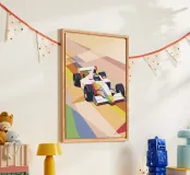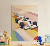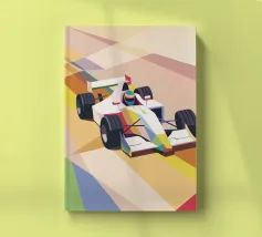 Illustrazione di una moderna auto di Formula 1 su una pista con uno stile geometrico moderno.