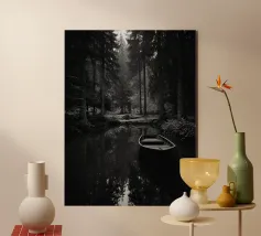 Una barca solitaria che galleggia su un lago riflettente nella foresta. Tranquillo, lunatico e cinematografico: una fuga senza tempo nel silenzio della natura.