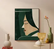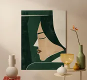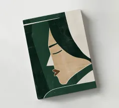 Un profilo astratto audace, ridotto alle forme essenziali e alla distorsione deliberata. La silhouette esagerata e i tratti del viso semplificati sfidano la simmetria, abbracciando l'imperfezione come struttura. Il verde bosco intenso circonda un tono della pelle caldo e strutturato, mentre i graffi visibili sulla superficie e gli effetti a pennellate stratificate introducono una crudezza tattile. Linee di contorno bianche e pulite incorniciano le forme organiche, creando tensione tra controllo e spontaneità.