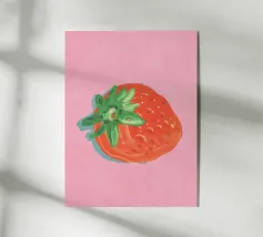 Un'affascinante illustrazione di una persona che indossa un costume da fragola con un'espressione simpatica.