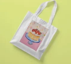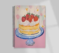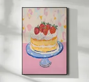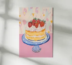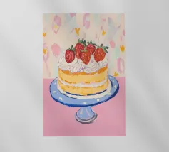 Una deliziosa torta di fragole con fragole fresche e panna montata, esposta su un grazioso supporto a pois blu.