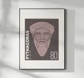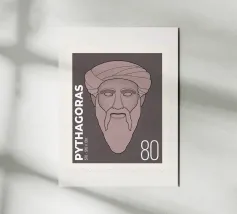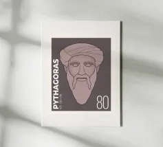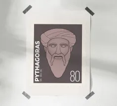 Illustrazione di un francobollo con l'immagine di Pitagora su sfondo trasparente. Il colore dello sfondo può essere personalizzato.